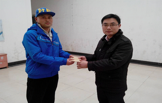 杨栋庭从电气工程系党总支副书记周猷手中接过师生们的爱心款
