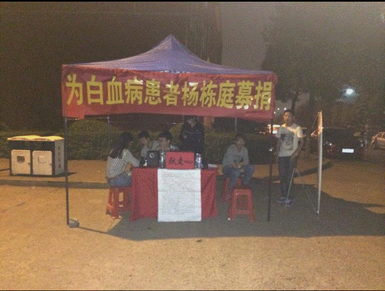 2014年5月21日,杨栋庭突然昏倒在寝室,送往医院经过两天时间的输血抢救,才暂时脱离了生命危险。医生通过杨栋庭的血液检测,确诊其得了急性白血病,需要马上手术和化疗。经过学院领导与湘雅医院多方协商,在病房床位已满的情况下,为杨栋庭同学争取了一张临时床位,辅导员赵宗康老师帮其垫付了一万多元的住院费。