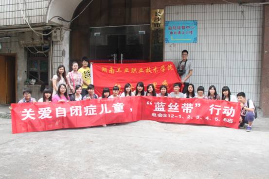 5月30日下午,我院经济管理系电会S12-1,2,3,4,5,6班部分学生在辅导员吴倩老师的带领下以“关爱自闭症儿童,‘蓝丝带’活动”为主题,来到长沙市天心区启航培智中心看望该中心的自闭症儿童,并给他们带来了蜡笔、纸和糖果等。