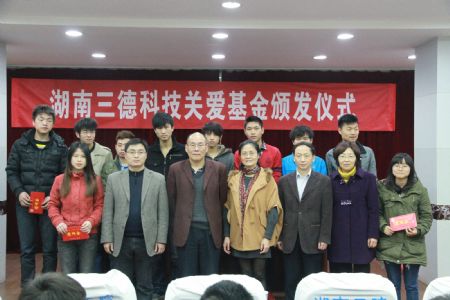 3月15日上午,“湖南三德科技关爱基金”颁发大会在我院一会议室举行。电气工程系机电S10-1班张群杰等10名同学每人获助1000元湖南三德科技关爱基金。