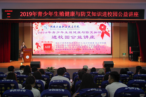 本网讯 5月22日,由长沙市团委、市妇联、市疾控中心、岳麓区疾控、市青彩防艾志愿者服务中心、市学校健康教育联盟等单位共同开展的“2019年青少年防艾知识进校园”公益讲座在我校大学生活动中心举行。学校各二级学院400名学生代表、辅导员代表参加了此次讲座,讲座由后勤处副处长熊革佳主持。