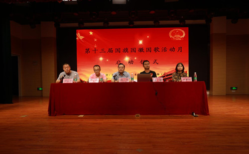 本网讯 9月18日,我校第十三届“国旗、国徽、国歌”活动月启动仪式在大学生活动中心举行。军训团总团长陈露、学校保卫处负责人及相关教师,校国旗礼仪队成员和部分新生代表参加启动仪式。