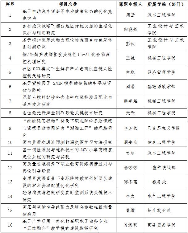 根据省教育厅《关于申报2022年度湖南省教育厅科学研究项目的通知》和我校《关于组织申报2022年度湖南省教育厅科学研究项目的通知》的通知要求,在纪检监察处的监督下随机抽取校外专家对申报的52项项目(含优秀青年项目11项、一般项目41项)进行评审,评审结果经学校审核批准,现将拟推荐项目公示如下: