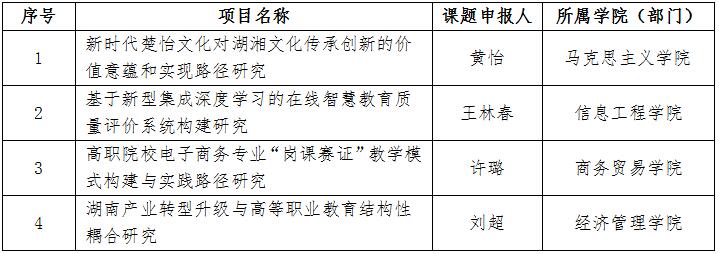 注:按照2022年湖南省教育厅科学研究项目校内指标分配表的择优推荐原则,由于电气工程学院和体育艺术部各有1个项目的专家评分未达到评审分数前50%,故按评审分数从高到低由工业设计与艺术学院和机械工程学院各1个项目进行择优推荐。