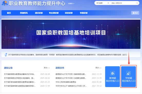 第一步:登录平台。登录国家智慧教育公共服务平台“职业教育教师能力提升中心”(网址:https://teacher.vocational.smartedu.cn/h/home/qysj/),点击“学校端项目报名入口”进入登录页面。用户名为参训学员所在学校的标识码,密码同2024年,初始密码为123456。