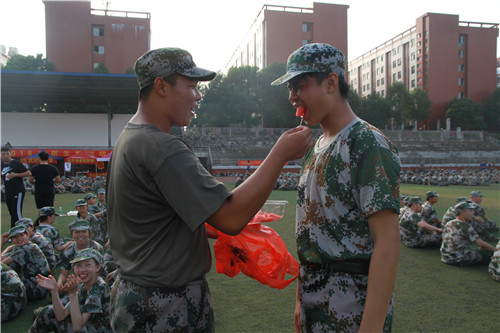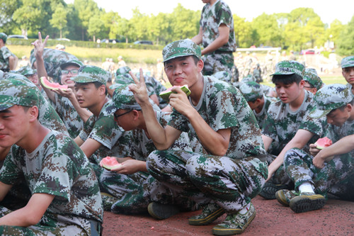 “同学们都很可爱,训练之余会一起开玩笑,这种关系让我们更亲近。助教们也很贴心,送来了‘清凉’的西瓜,就让他们‘偷乐’一会儿。”六营营长给学生喂西瓜吃,平日严肃的面庞露出关爱的微笑。