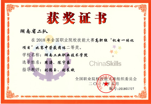 本网讯 由国家教育部主办的2018年全国职业院校技能大赛高职组“机电一体化项目”赛项在天津机电职业学院举行。我校电气工程学院派出了由刘德玉、刘良斌担任指导教师,电气工程学院周涛、陈宇豪两位学生组成的参赛代表队参加此项比赛。通过激烈角逐,我校代表队荣获高职组“机电一体化项目”赛项二等奖,为我校此次国赛赢得了开门红。