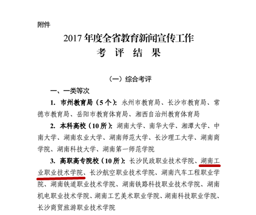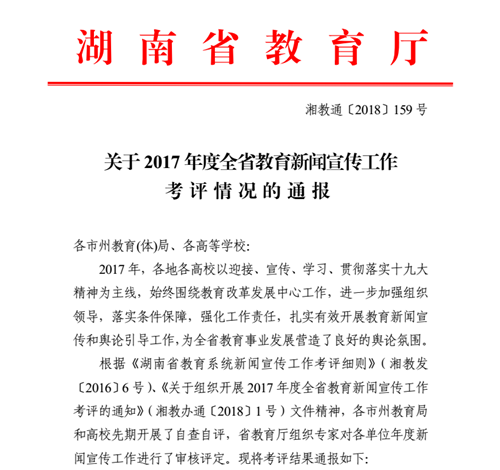 本网讯 近日,湖南省教育厅下发《关于2017年度全省教育九游·官方网站宣传工作考评情况的通报》(湘教通〔2018〕159号),经省教育厅对全省教育系统九游·官方网站宣传工作的审核评定,我校作为全省10所高职院校之一,被认定为综合考核“一类等次”单位。党委宣传部杨莎莎老师被评为2017年度先进个人。