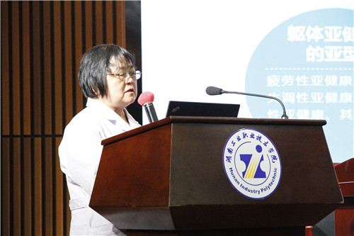 全科医学专家、湘雅附二医院肿瘤科专家郭凯平教授带来了题为“健康与亚健康”专题讲座。她指出,健康的五大基石是:合理膳食、适当运动、良好的生活习惯、平衡心理、充足睡眠。郭凯平教授介绍,亚健康是介于疾病和健康的中间状态,未发现有疾病,而病人自己确实感到躯体和心理上的种种不适。亚健康多表现为慢性疲劳,还包括睡眠紊乱、异常情绪及类流感样症状。随着生活、工作压力的不断上升,她建议老师们调理好饮食和睡眠,进行适当的运动,戒烟戒酒,保持良好的心态,还可以适当接受按摩、针灸、中药等中医调理。