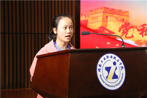 新学员代表营销S2017-3班的曹华平讲话。她强调自己争取成为一名共产党员的决心与毅力,并代表全体学员承诺在之后的党校学习中将以最饱满的热情、最全面的投入、最实际的行动来完成党课学习。
