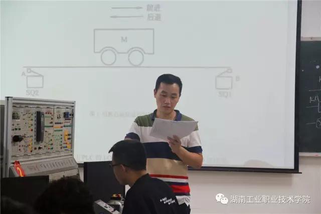 第一批考核的学生按要求在指定位置坐好后,何其文向学生展示今天的考核题目并讲述考核的要求:“要将程序、接线图、I/O分配写到资料上,然后在仪器上接好线。”
