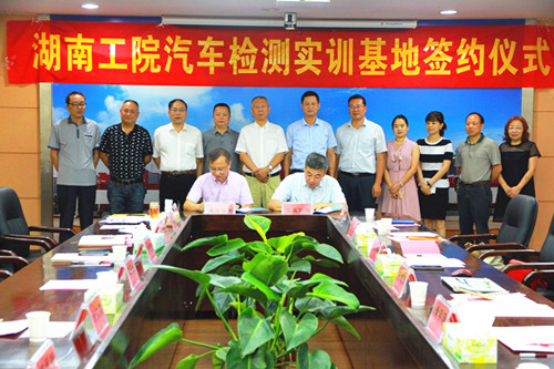 随后,双方进行了签约仪式。我校副校长董建国和长沙捷运汽车检测有限公司总经理佘文高代表合作双方共同签署了《共建汽车检测实训基地协议》,合作期限为21年。据悉,此次合作从项目提出到论证确定从实、施方案构思到目标敲定、从谈判小组的组建到达成共识,历经三年。该项目建成后,将为长沙岳麓科技产业园经济发展、为检验检测人才队伍建设,为促进湖南装备制造迈向新高度,为建设制造强省贡献力量。