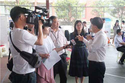 在我校校长刘建湘(右二)、副校长邓建国(右三)等陪同下,省人力资源服务中心主任姜春华(右一)与企业代表交流并接受媒体采访