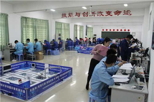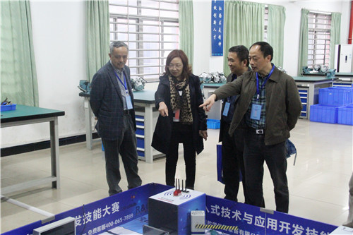 赛前,各参赛队在指导老师带领下依次进行检录、工位抽取、工具检查等准备工作。比赛过程中,参赛选手精神饱满,队员之间全力配合,充分展示了扎实的技能功底。我院副院长邓建国、邱丽芳及相关高职院校负责人高度重视比赛,现场指导工作,裁判员一丝不苟,教师工作人员积极配合,部分学生志愿者也利用课余时间协助站岗执勤,为比赛提供了公平、公正、便利、舒适的环境。