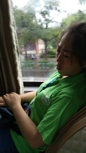 在返校车上,抽空小憩的志愿者