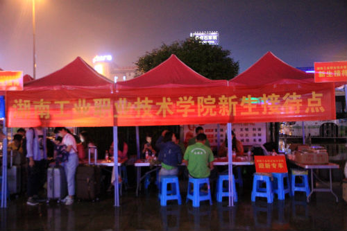 夜幕降临,仍然守候在车站迎新接待点的志愿者们