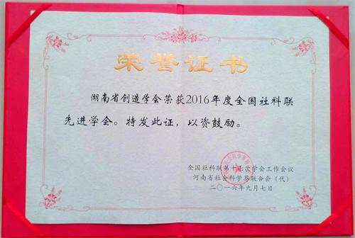 本网讯 由我院院长刘建湘教授担任会长的湖南省创造学会,因创新教育和学会其他工作成绩显著,近日被授予“全国社科联先进学会”荣誉称号。