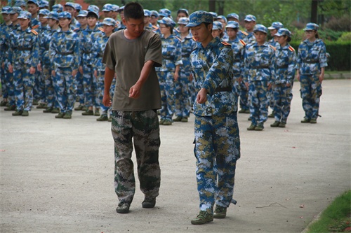 教官针对踏步中出现问题的同学进行单独指导。
