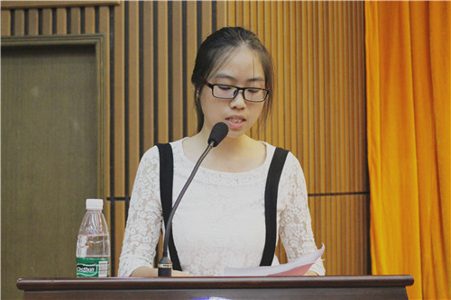 新学员代表、商贸旅游系外贸S15-1班的唐湘圳同学在发言中抑制不住内心的激动和喜悦之情,她表示将珍惜这次培训班学习机会,与大家共同进步,快乐成长,顺利结业。