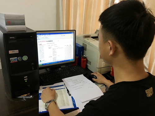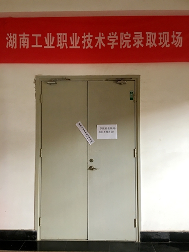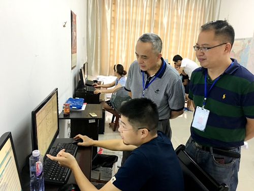 8月10日上午9时,招生录取工作现场,工作人员向学院招生录取领导工作小组副组长、副院长邓建国(中)介绍录取工作情况