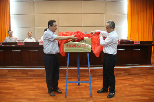 我院副院长邓建国(右)与卫爱军共同为“江苏省盐城市亭湖区企业技能人才工作站”揭牌