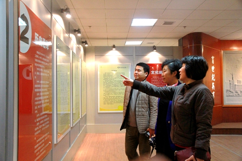 调研员刘琼向湖南石油化工职院来访客人介绍校史情况