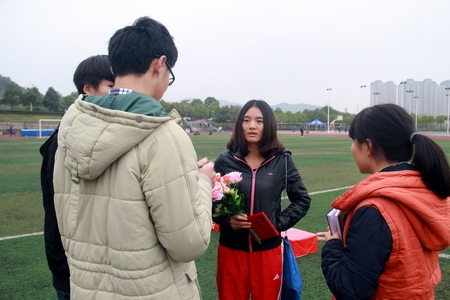 电会S14-10班邓素君同学在女子400米预赛后接受学生记者采访时说:“我对自己的预赛成绩不是很满意,天气多少有一些不利因素,而且我不是体育特长生,平时没有经过专业的训练,但是我相信自己,一定争取拿下决赛冠军。”最终,经过激烈角逐,在400米决赛现场,她夺得了该项目比赛的冠军。