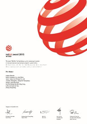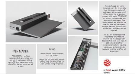 本网讯 近日,德国红点设计大奖(Red Dot Design Award)颁奖典礼在新加坡红点博物馆落下帷幕。我院现代设计艺术系戴喆老师参与完成的创新设计作品《Pen-Maker》喜获红点设计奖(Red Dot Award: Design Concept 2015)。