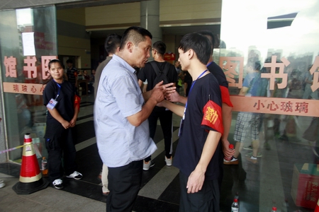 保卫部成员向家长解释报到处“家长止步”的要求