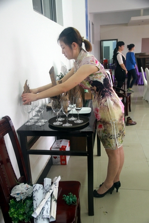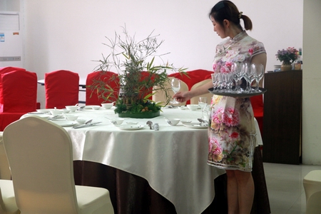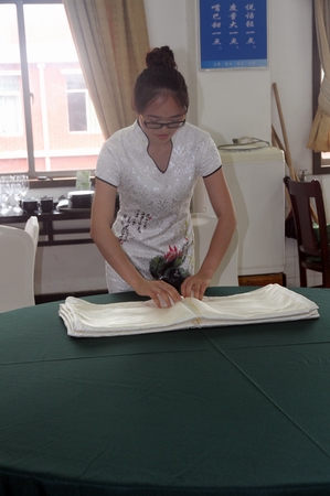 此赛项主要训练内容是摆台、餐中折花、插花等,与此同时,步伐、表情、仪态也都在练习范围之内。