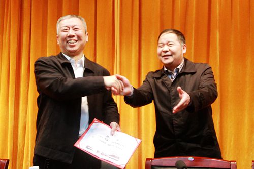 院长刘建湘教授(右)代表学院向何建国高级工程师颁发客座教授聘书