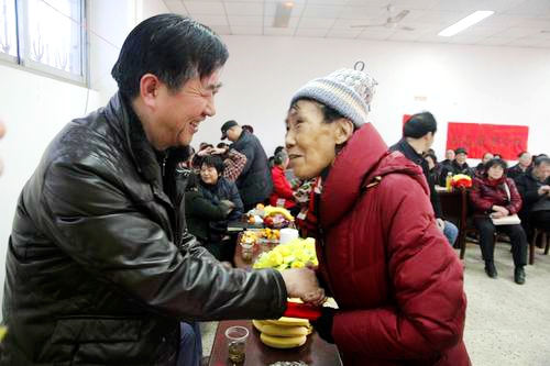 获得长寿之星的老人领奖时与党委书记熊琦交流