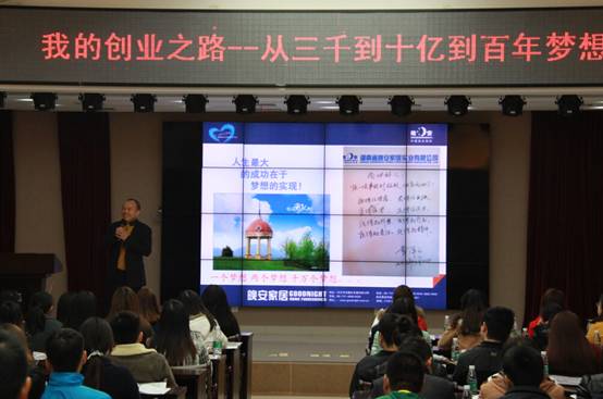 晚安工业园优美的环境、洁净的车间,井然的工作秩序、严格的管理制度给老师和同学们留下了深刻印象。公司董事长曹泽云为师生们作了一堂题为“我的创业之路,从三千到十亿到百年梦想”专题讲座。曹泽云从年轻时的艰辛谈到现在取得的成就,从个人的奋斗谈到晚安的百年梦想,让在座师生经历了一次非常生动的创业教育和理想道德教育。晚安家居学院行政院长辛栎为同学们做了主题宣讲,对学生未来职业生涯规划等提供了帮助,宣传了“晚安班”的办学模式和机制,宣讲了“春耕计划”的相关内容。