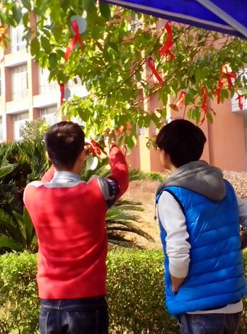 同学们为许愿树系上红丝带