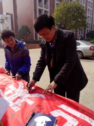 12月1日中午,学生公寓门口人头攒动,爱在心间万人签名活动正在进行。机电S13-1班王同学表示,虽然只是签上一个名字,但简单的形式也能表现出自己那份不可或缺的爱。横幅上的签名,都是一个个爱的祝福。