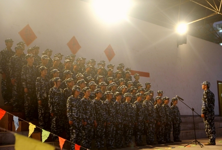 宽阔平整的训练场,身穿蓝色军训服装的学子,迈着整齐如一的步伐登台演唱,浑身散发军人的骄傲。当《打靶归来》、《精忠报国》、《地道战》、《军中绿花》等歌曲在观众耳边响起的时候,那动人的旋律就是我们心中的信仰。新生们嘹亮的歌喉,坚毅的目光,深情的向我们传达着爱党爱国的决心。2014级新生用他们嘹亮的歌声展现了新时代大学生昂扬向上的精神风貌,更以一种无所畏惧的朝气为自己唱响了美好的明天。