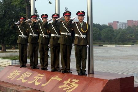 我们是国旗礼仪队成员,我们在新纪元广场国旗下。不要小看这样一个简单的行军礼,它凝结了我们每日训练的努力与执着,这也是你们在求学路上要具备的品质。加油吧,2014级新人们!