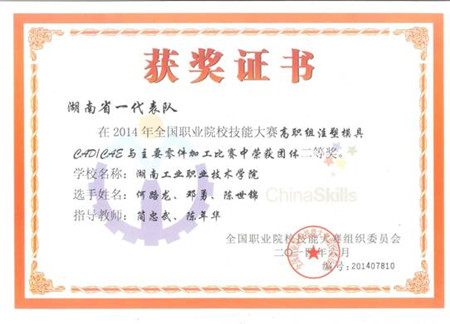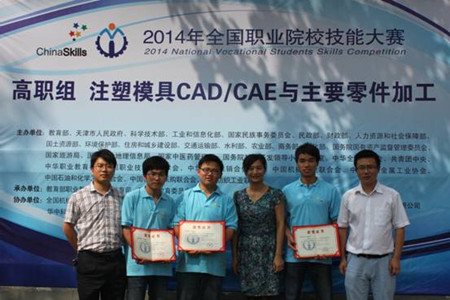 本网讯 6月23日至6月26日,2014年全国职业院校技能大赛高职组“注塑模具CAD与主要零件加工”赛项在天津轻工职业技术学院举行,我院派出的由简忠武、陈年华担任指导教师,汽车工程学院2011级模具专业何路龙、邓勇、陈世锦三位学生组成的代表队,勇夺全国职业院校技能大赛“注塑模具CAD/CAE与主要零件加工”赛项团体二等奖。