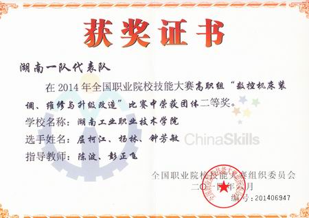 6月23日至6月26日,2014年全国职业院校技能大赛高职组“数控机床装调、维修与升级改造”赛项在天津机电职业技术学院成功举行,“数控机床装调、维修与升级改造”赛项有来自全国53支代表队参与角逐,我院派出的由陈波、彭正飞担任指导教师,机械工程系2011级数控设备应用与维修专业屈柯江、钟芳敏,机制专业2012级杨林三位学生组成的代表队,经过参赛选手的团队协作、努力拼搏,荣获全国职业院校技能大赛“数控机床装调、维修与升级改造”赛项团体二等奖。