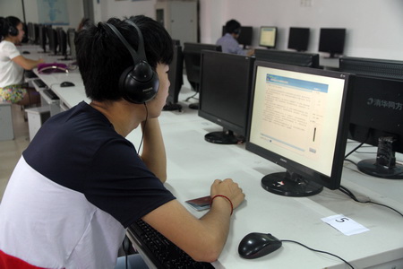 此次普通话测试是我院第二次开展计算机辅助普通话测试。普通话测试的前三题由考生根据计算机屏幕显示的内容进行朗读,并由计算机评分。第四题说话题由考生对着话筒讲说后,系统将第四题说话题分发到2名测评员管理账户进行评分,最后合成总分即为考生的最后得分,排除了人为干扰因素,使普通话水平测试工作更加规范、公正、客观、科学。