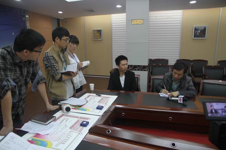 本网讯 5月16日下午,我院在办公楼二会议室举行“巴黎国际发明金奖”获得者张江杰同学媒体交流会。湖南卫视、湖南教育电视台、湖南经视、湘声报、三湘都市报、长沙晚报、潇湘晨报等媒体记者参加了交流会。