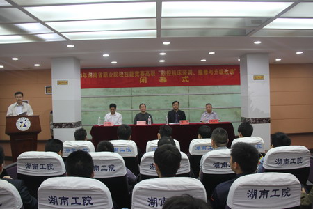 本网讯 5月18日上午,2014年湖南高职院校“数控机床装调、维修与升级改造”项目技能竞赛经过两天的激烈角逐,在我院办公楼第一会议圆满落幕。我院副院长陈超、省教育科学研究院职成所所长孙添、本次赛项裁判长周继伟,省派联络员、省机械行业管理办公室殷明辉科长等领导出席闭幕式,我院教务处处长李力夫主持闭幕式。