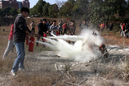 消防灭火训练现场,训练总教官盛正军老师为参加训练人员进行消防知识讲解,详细讲述了灭火器的种类、灭火时要注意的安全细节、如何正确规范使用灭火器、以及人员紧急疏散注意事项、宿舍怎样预防火灾等校园消防安全常识。盛老师一边讲解一边在点燃的干木堆上为大家示范如何操作灭火器。现场师生人手一个灭火器,根据盛老师所讲的灭火要点进行操作,不到几分钟,熊熊烈火基本被扑灭。