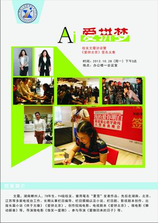 由我院党委宣传部、招生就业处、院团委联合举办的校友文霞访谈暨《爱拼北京》新书签名义售活动将于10月28日下午3点在办公楼一会议室举行。