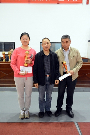学院工会主席张志勇(中)为获得最佳组织奖和体育道德风尚奖的团队代表颁奖