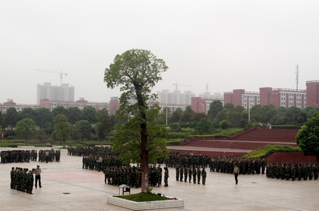 短暂的休息时间,新生们按照队列位置席地而坐。教官给大家讲军营趣事,教大家唱军歌,唱到动情处,一些女生开始想家,眼角湿润。可是一旦两个连队开始拉歌,女生们又会马上振作起来,使出浑身力气,为自己的集体争取更大胜数。训练场上到处飞扬着歌声、笑声、鼓掌声、呐喊声,一排排的迷彩绿成为校园里最独特的风景线。