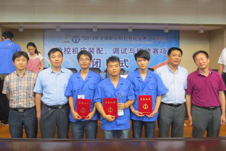 中国机械工业教育发展中心主任陈晓明(右二)与获得一等奖的我院“数控机床装配、调试与维修”赛项代表队合影