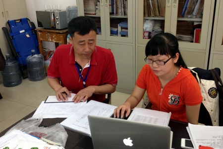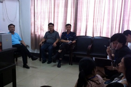 学院党委副书记周立华(左一)听取相关考核情况汇报