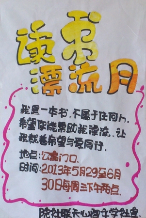 “赠人玫瑰,手有余香。图书漂流就是使书籍在素不相识的人之间传递阅读的过程。没有借书证,不需付押金,也没有借阅期限,其目的就是给读者一个更加自由的阅读空间,提供一个相互交流的平台,读者可以通过在书中加标签等形式把阅读的感悟传递给下一位读者,在图书漂流的同时,让思想的火花也漂流起来。”院图书馆馆长周承华表示。