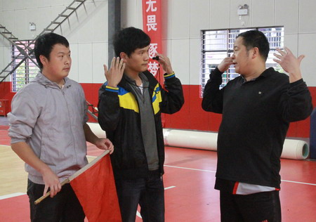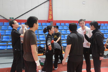 学生裁判利用场下休息时间和刘建湘院长(右一)交流裁判手势